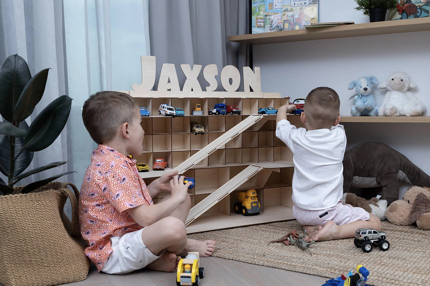 As our boys grew up, their needs changed too. We had a ton of toy cars, and that's when we thought, "Let's make a special shelf for these cars." That's how our big toy car garage came to be.